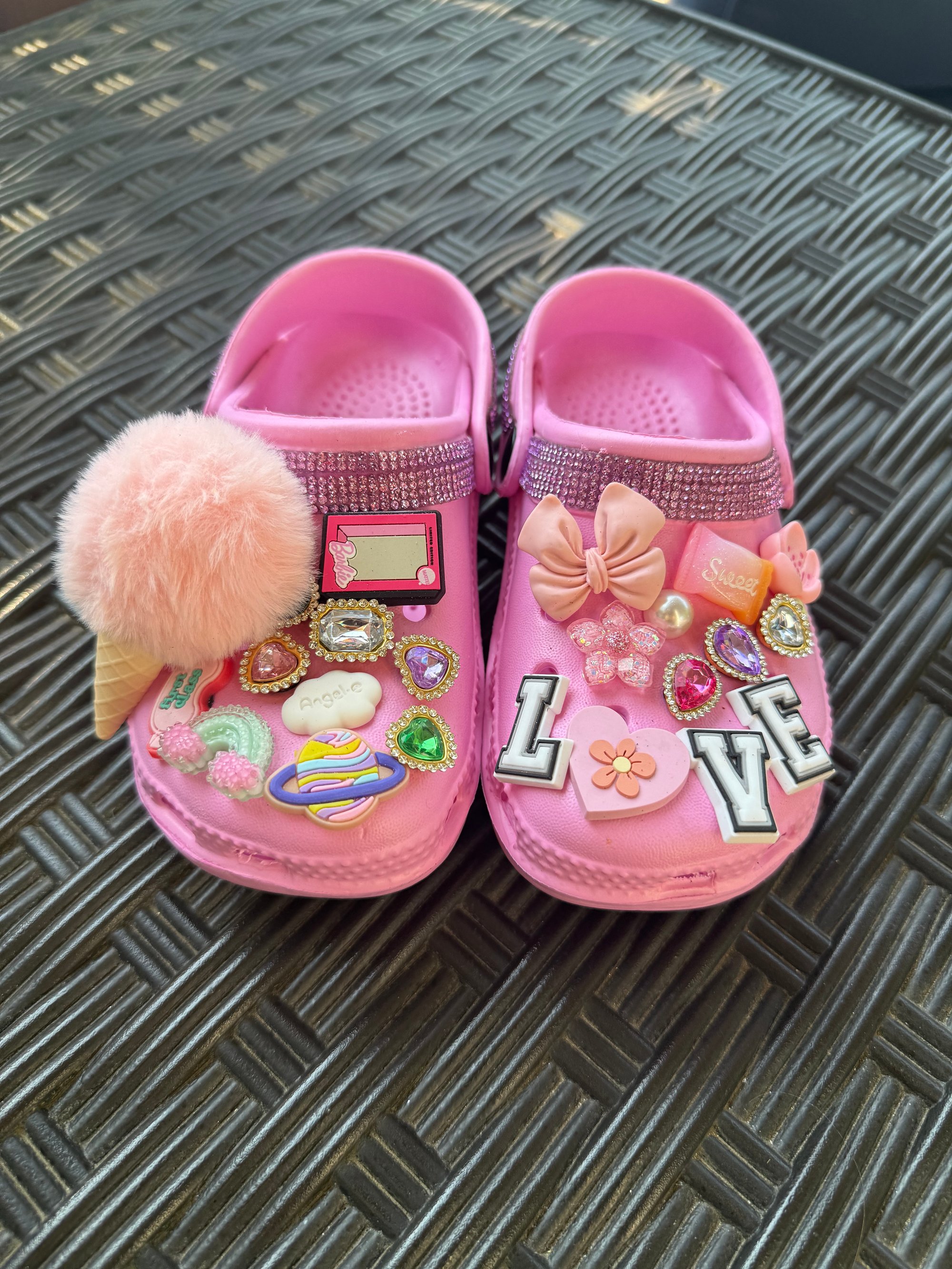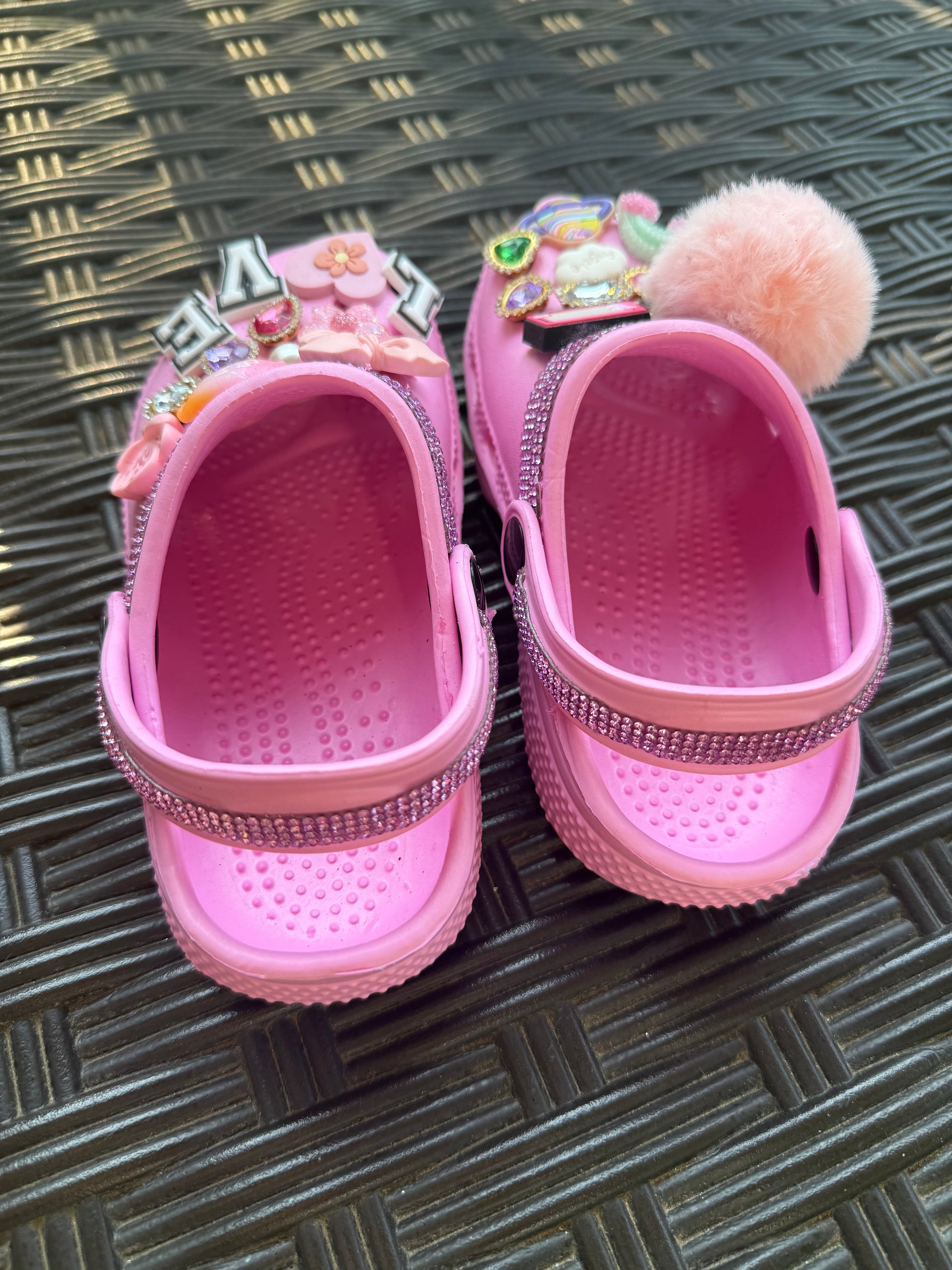 These Cute Clogs Are beautiful And fun! Perfect for on the go and when it's time to stand out! Each Charm is hand picked to fit the theme of the clog. And we all know Rhinestones are a kids best friend!! So we've placed Rhinestones across the top of the clog and across the strap that supports the ankle. Hand crafted with Love.