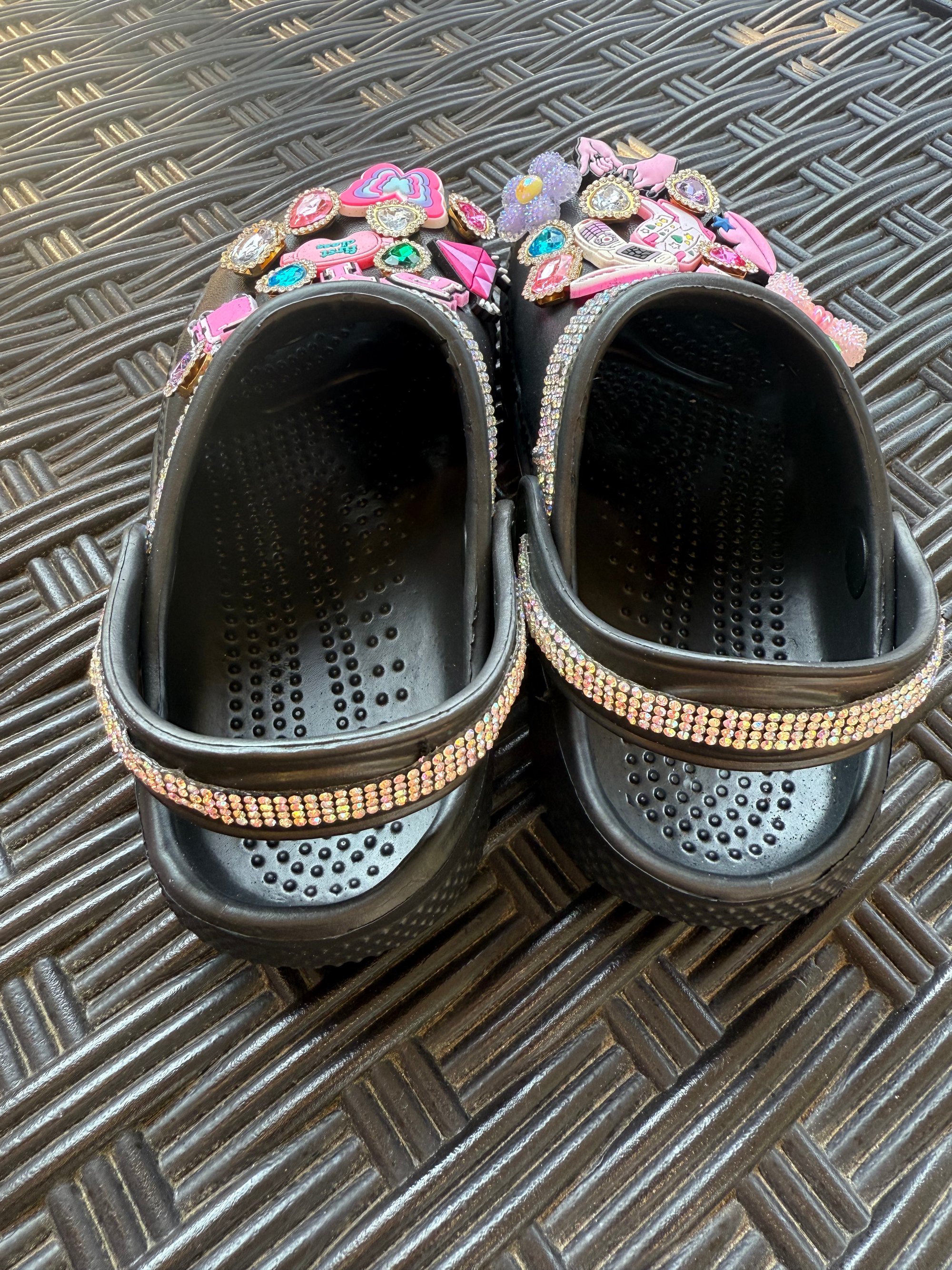 These Cute Clogs Are beautiful And fun! Perfect for on the go and when it's time to stand out! Each Charm is hand picked to fit the theme of the clog. And we all know Rhinestones are a kids best friend!! So we've placed Rhinestones across the top of the clog and across the strap that supports the ankle. Hand crafted with Love.